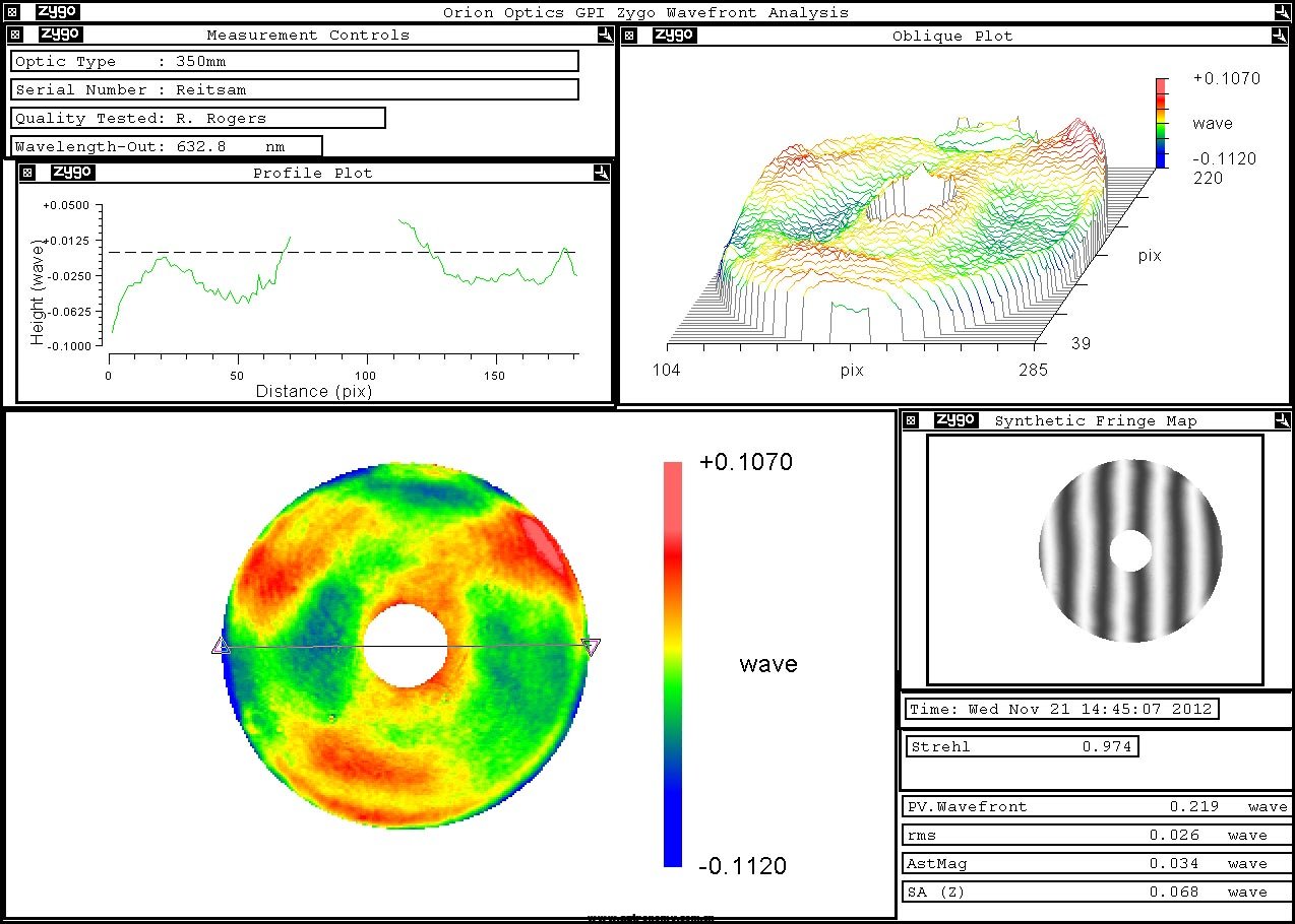 面型的兩個(gè)參數(shù)PV和RMS值,PV是表示路面的最高處與最低處的差值,即波峰波谷值;RMS值是全部路面高低的平均值,即均方根值。因此,PV值能夠做到0.1個(gè)波長,RMS值至少在0.02左右,一般來說,PV值是RMS值的6-8倍。目前很多商家說出所謂的1/8波長或1/10波長實(shí)際上多指RMS值,其PV值往往達(dá)不到1個(gè)波長,而良好的天文觀測器材應(yīng)該具備PV=1/2波長才算是精度比較好的。